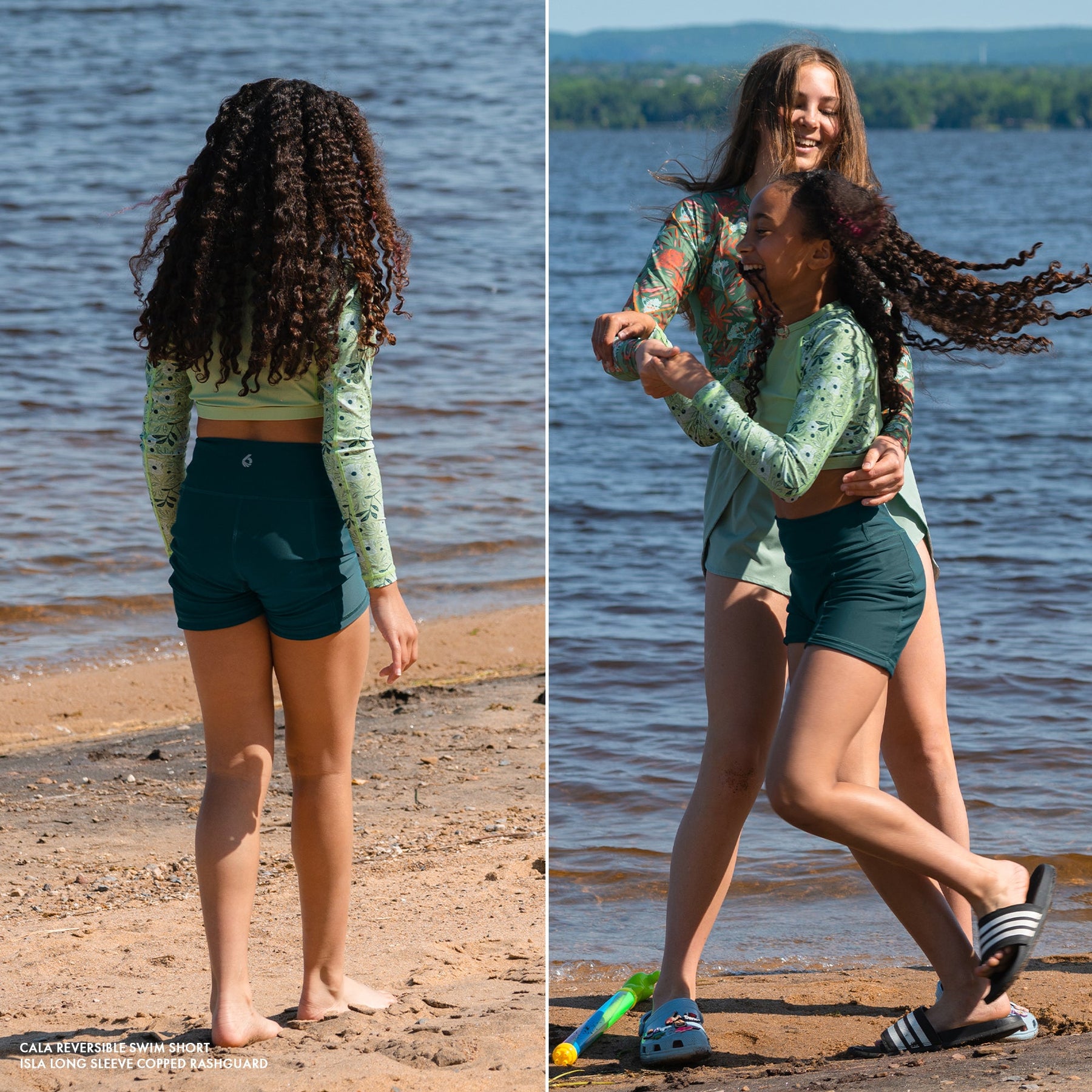 The Cala are reversible high-waisted swim shorts that offer more coverage than a traditional bikini bottom. Its design features quick-drying fabric to keep your little one comfortable all day. The Cala is perfect for beach sports and paddling of all types.