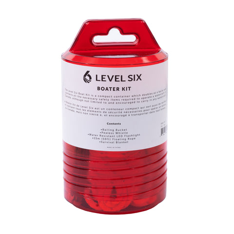The Level Six Boater Kit is a compact container which doubles as a bailer and contains all the necessary safety items required to operate a watercraft in Canada, although not limited to and encouraged to carry in any watercraft.