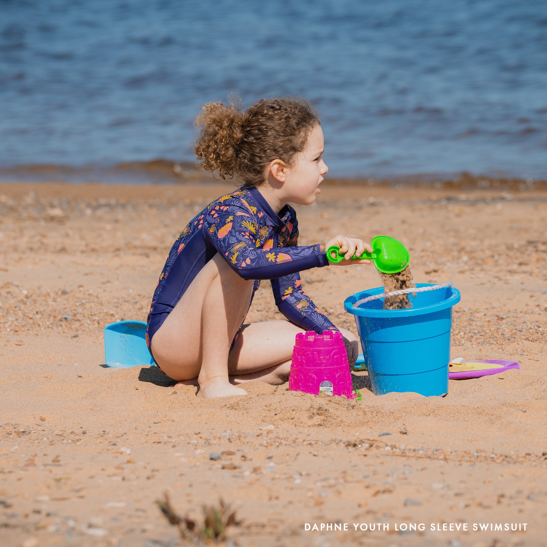 The Daphne is a one-piece swimsuit designed for effortless days spent on the beach. The front half zip entry makes for an easy on and off, while the long sleeves offer low-maintenance sun protection. The soft recycled Nylon allows your child to bask in the joy of the sun while staying safe and comfortable in style.